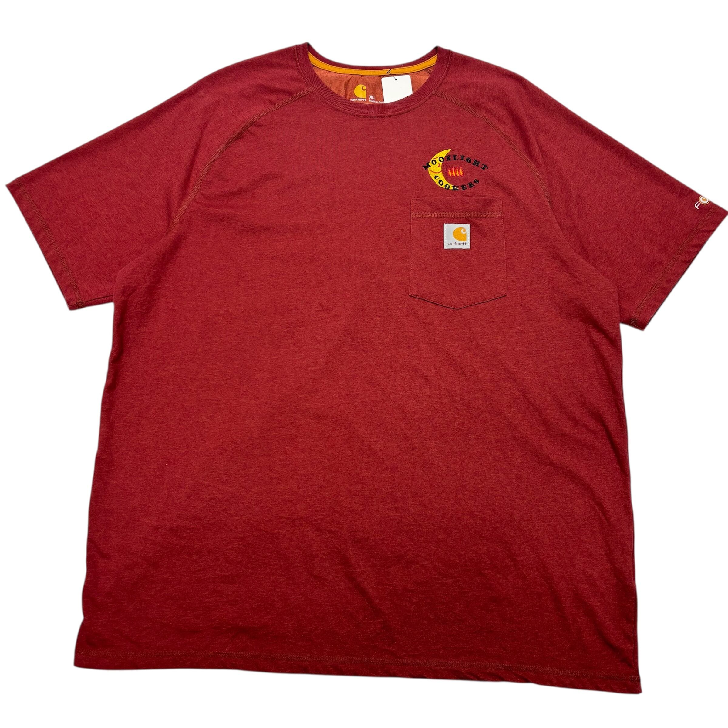Carhartt FORCE カーハート 半袖 Tシャツ ポケT エンジ ボルドー 2XL相当 企業ロゴ チームロゴ 刺繍 MOONLIGHT COOKERS 月 キャラクター ワーク アウトドア メンズ 古着 ビッグサイズ 速乾【1144ST】