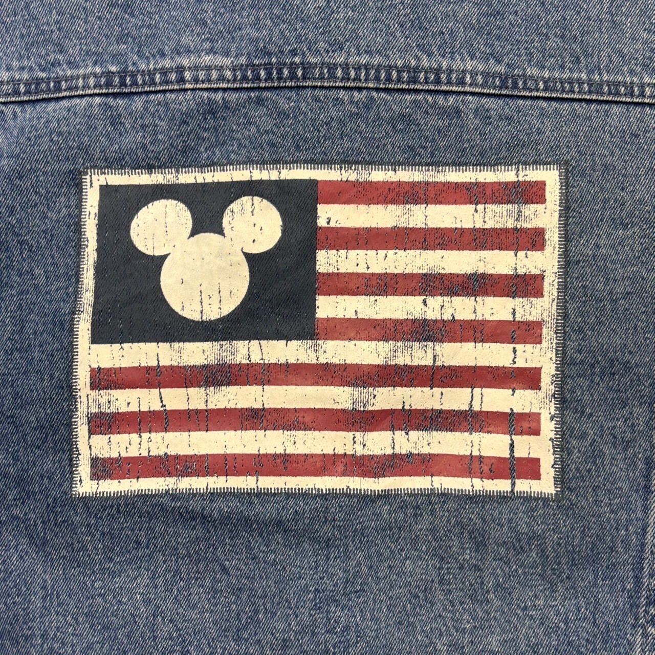 【ATTO】90s ディズニーストア デニムジャケット M ミッキー 星条旗 国旗 柄 バックプリント Gジャン ジージャン ヴィンテージ 古着 Disney Store メンズ レディース アメカジ グランジ 春アウター 希少 マカオ製【6046ST】