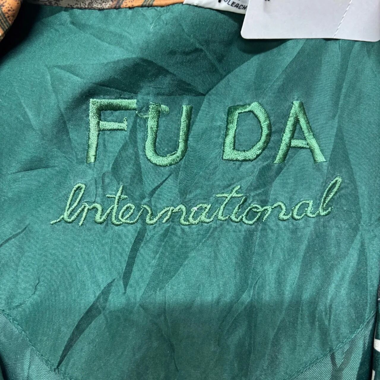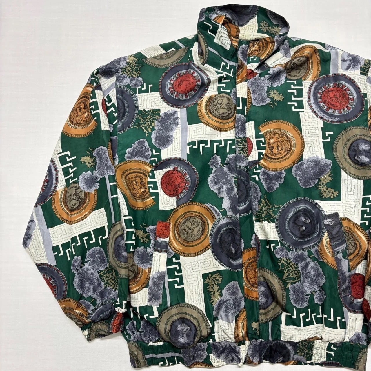 【ATTO】FU DA シルク ブルゾン ジャケット XL 緑 総柄 バロック柄 チェーン柄 スカーフ柄 100%シルク 古着 90s ヴィンテージ オーバーサイズ ビッグシルエッストリート HIPHOP 派手 個性的 アウター ジャンパー ヴェルサーチ風【6044ST】
