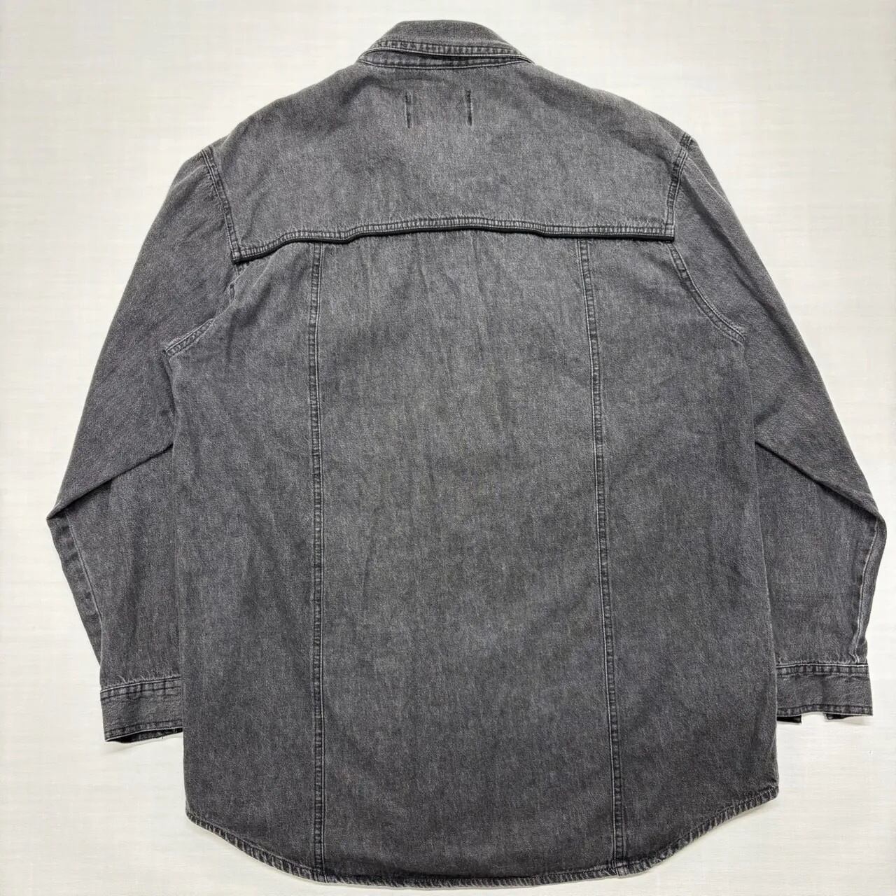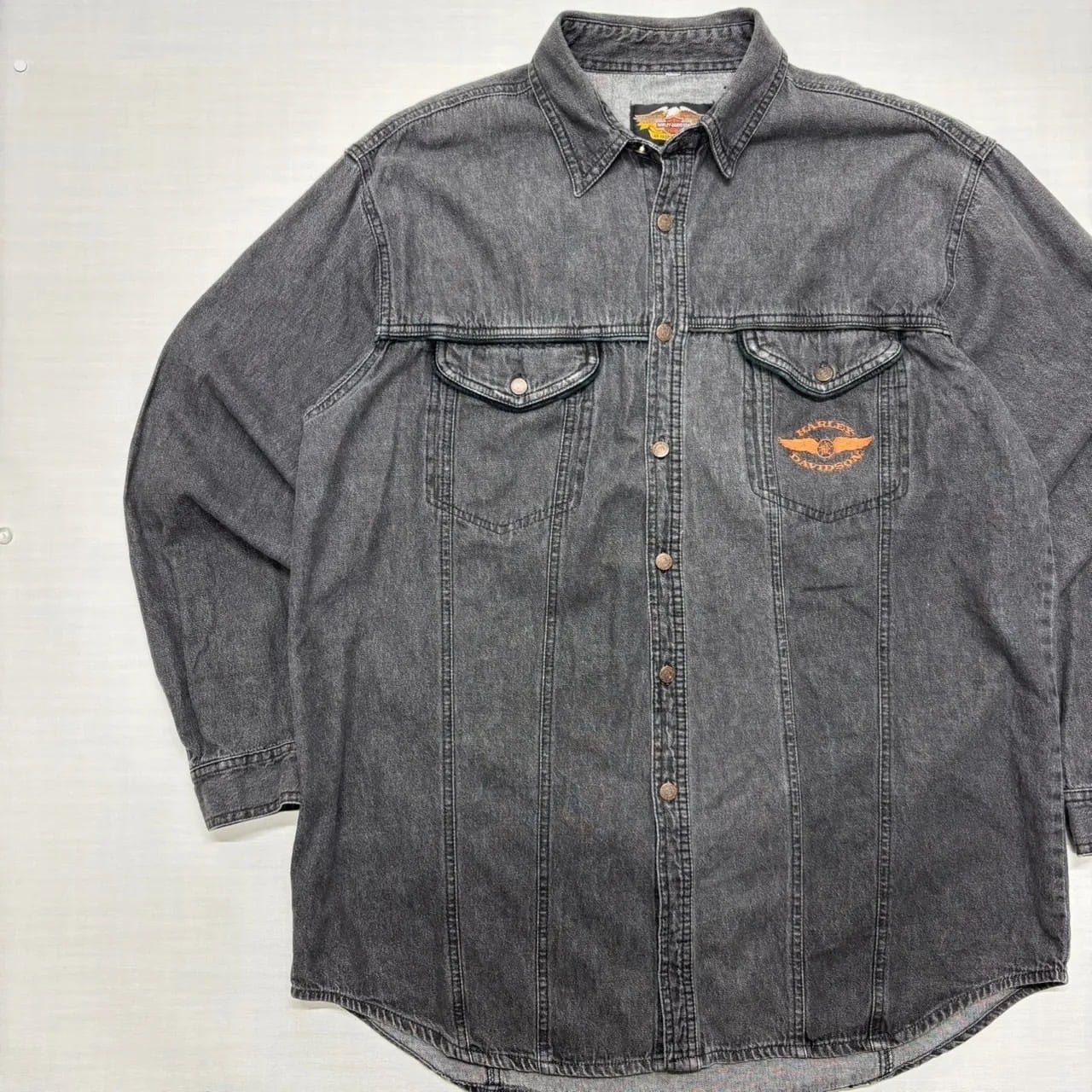 【ATTO】ハーレーダビッドソン 長袖デニムシャツ 墨黒 XL相当 ウィングロゴ刺繍 パネル切替 メタルボタン 雰囲気系 グランジ バイカー ライトアウター 古着【2059ST】