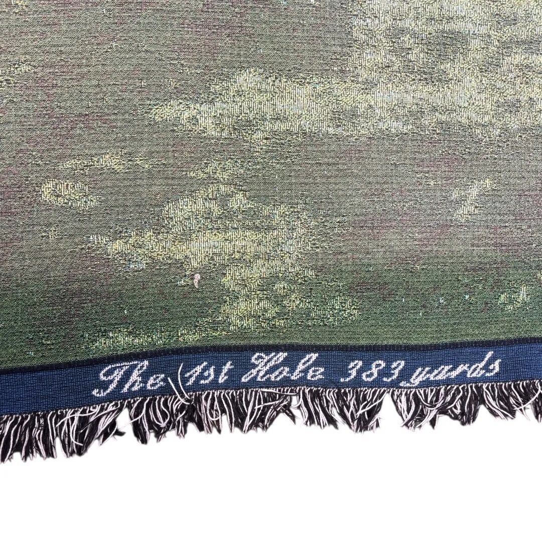 ゴルフコースの第1ホール(The 1st Hole 383 yards)の景色と、雪を抱いた山々の雄大な風景が、複雑で高級感のあるジャガード織りで表現されています。