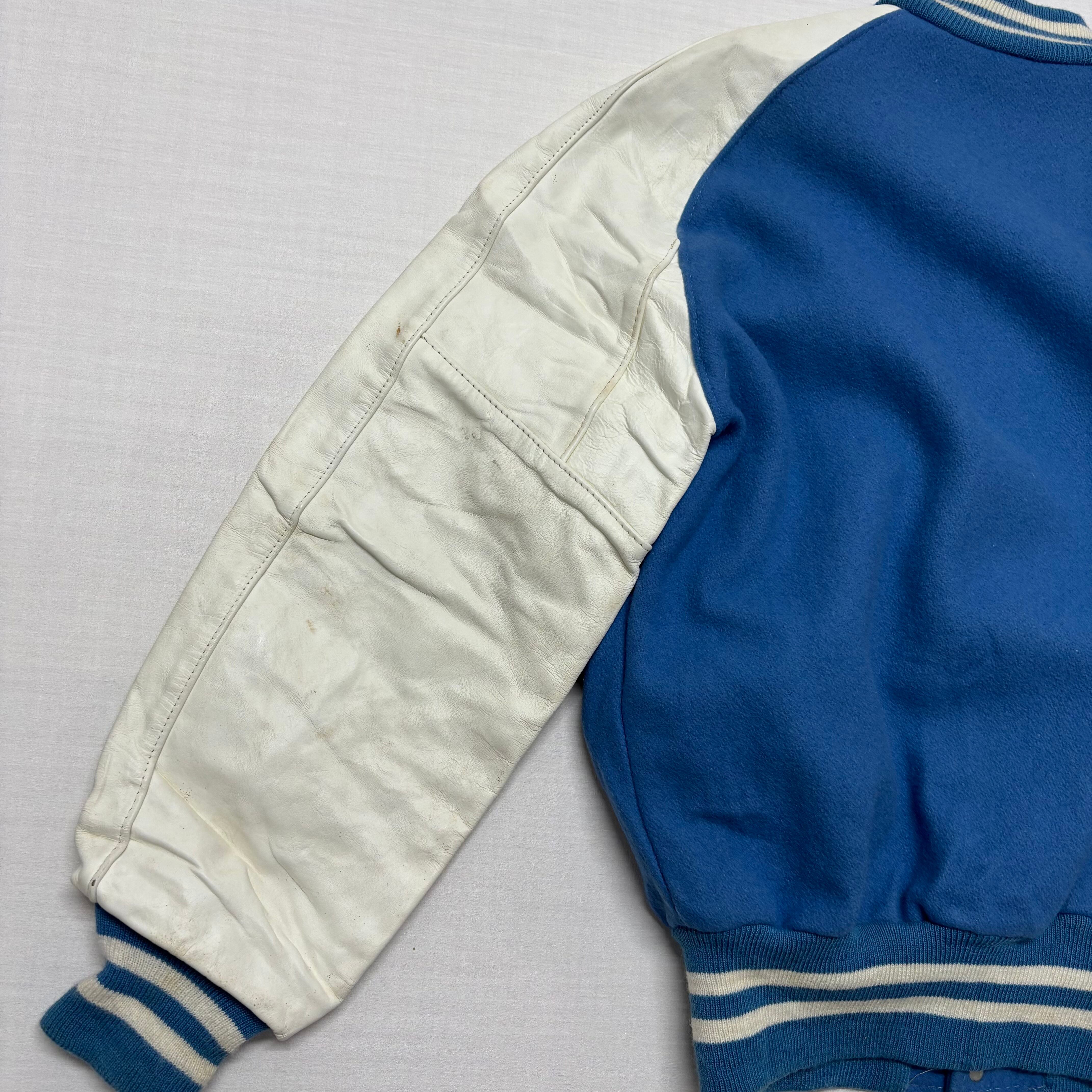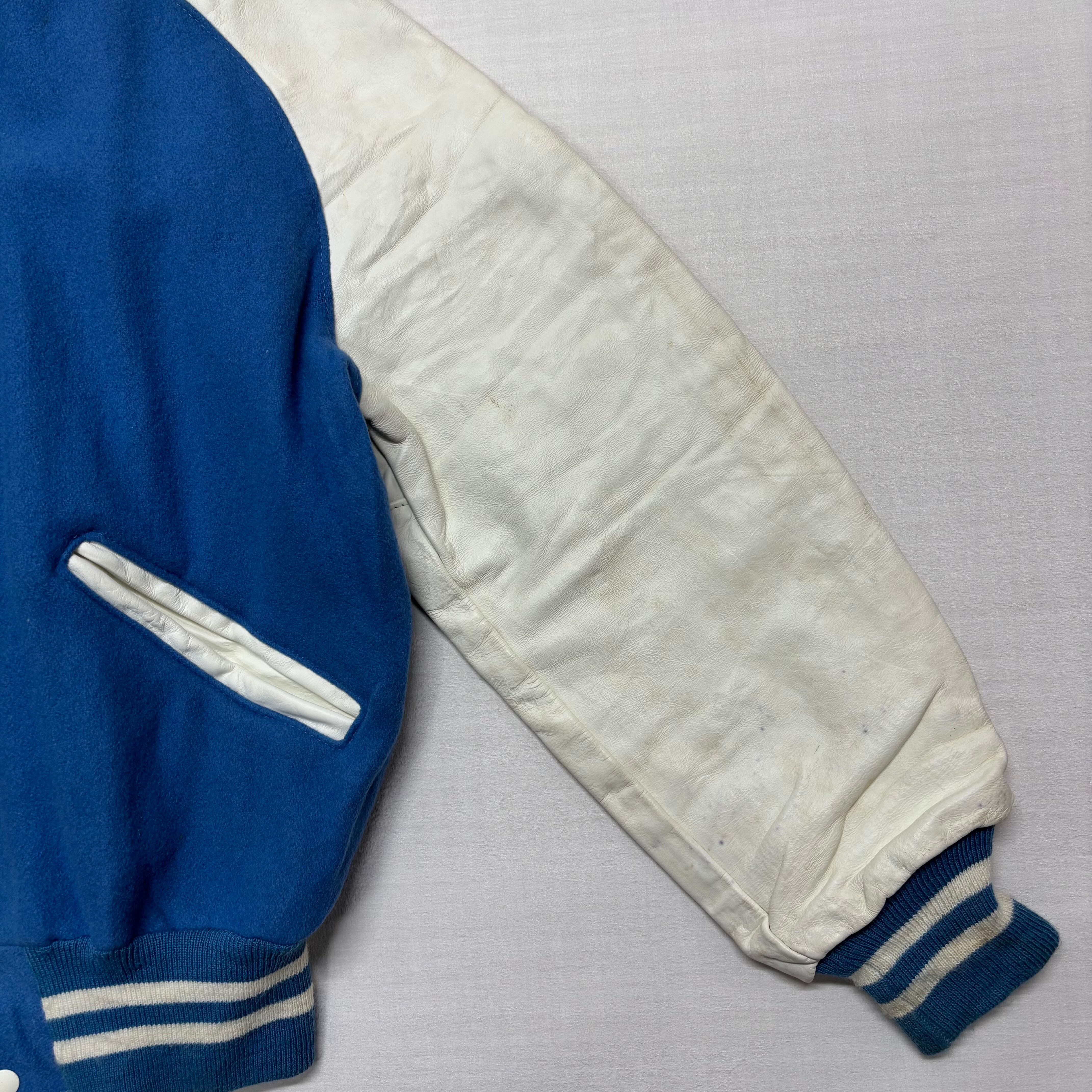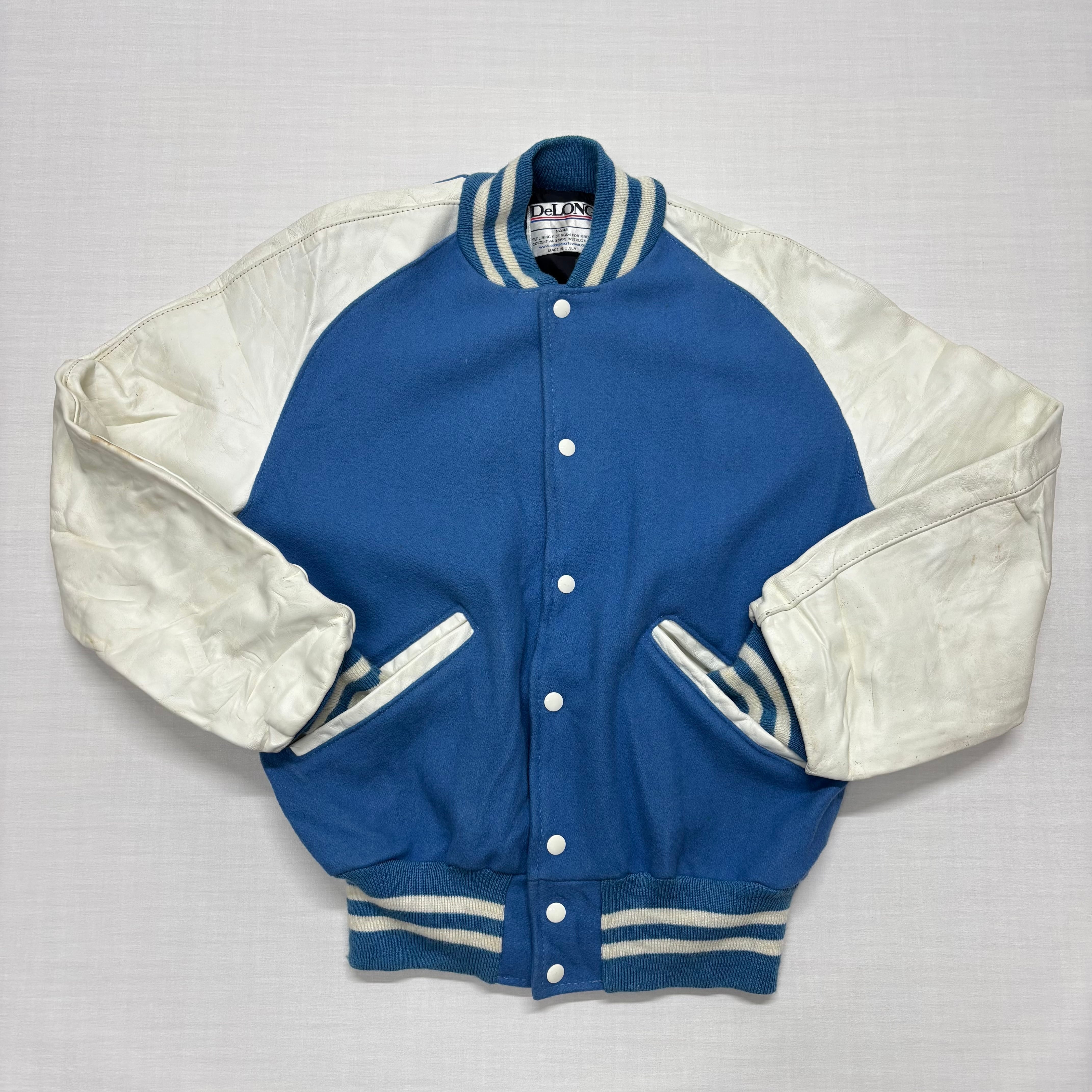 【ATTO】DeLONG USA製 スタジャン ウール レザー 切替 ブルー ホワイト L相当 アワードジャケット 本革 袖革 ヴィンテージ メンズ 古着 アメカジ ストリート【6064ST】