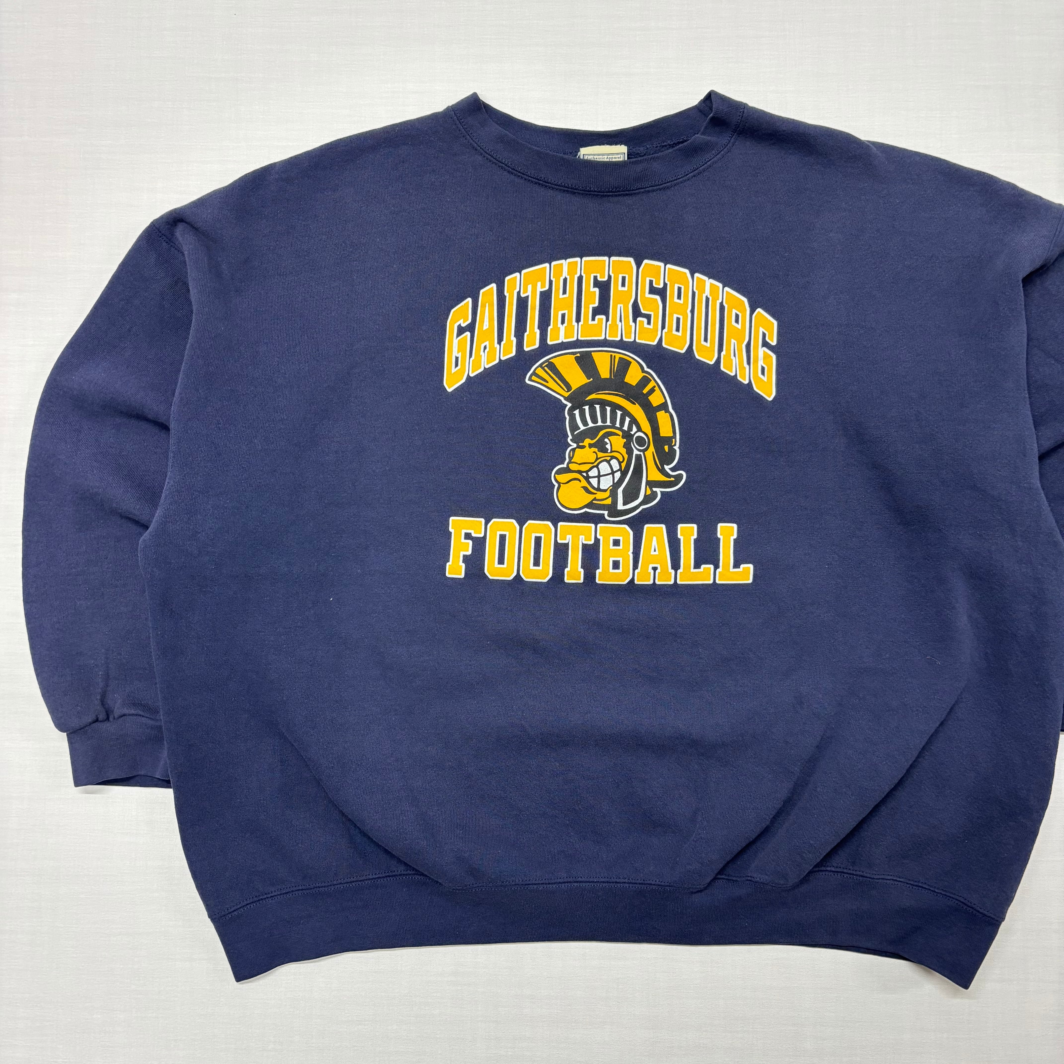 デザインは「GAITHERSBURG FOOTBALL」のスパルタンロゴで、ネイビー×イエローの配色は合わせやすさ抜群。