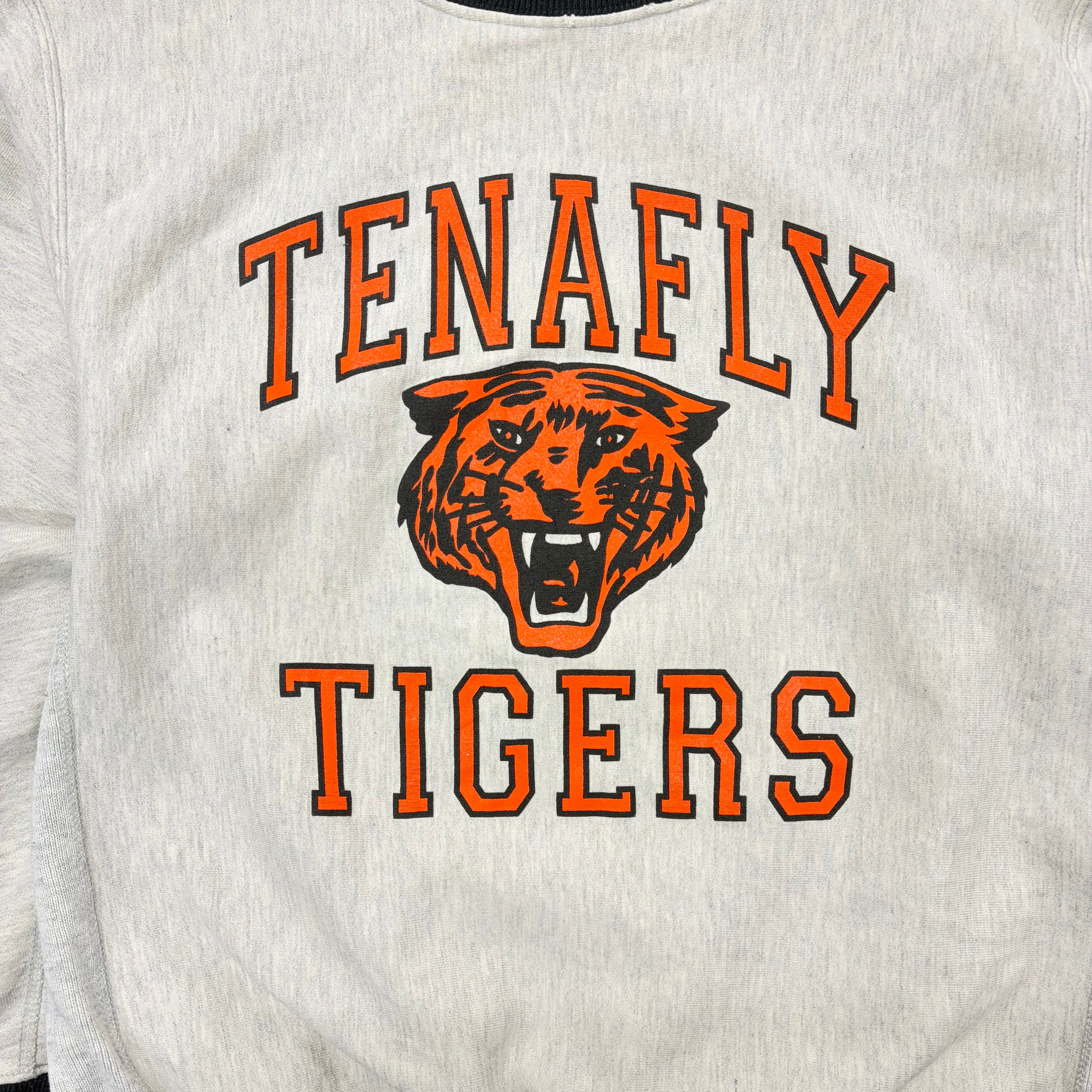 目を引く「TENAFLY TIGERS」のカレッジプリントと、襟・袖・裾のオレンジ×ブラックのリブラインが完璧な配色の一着です。