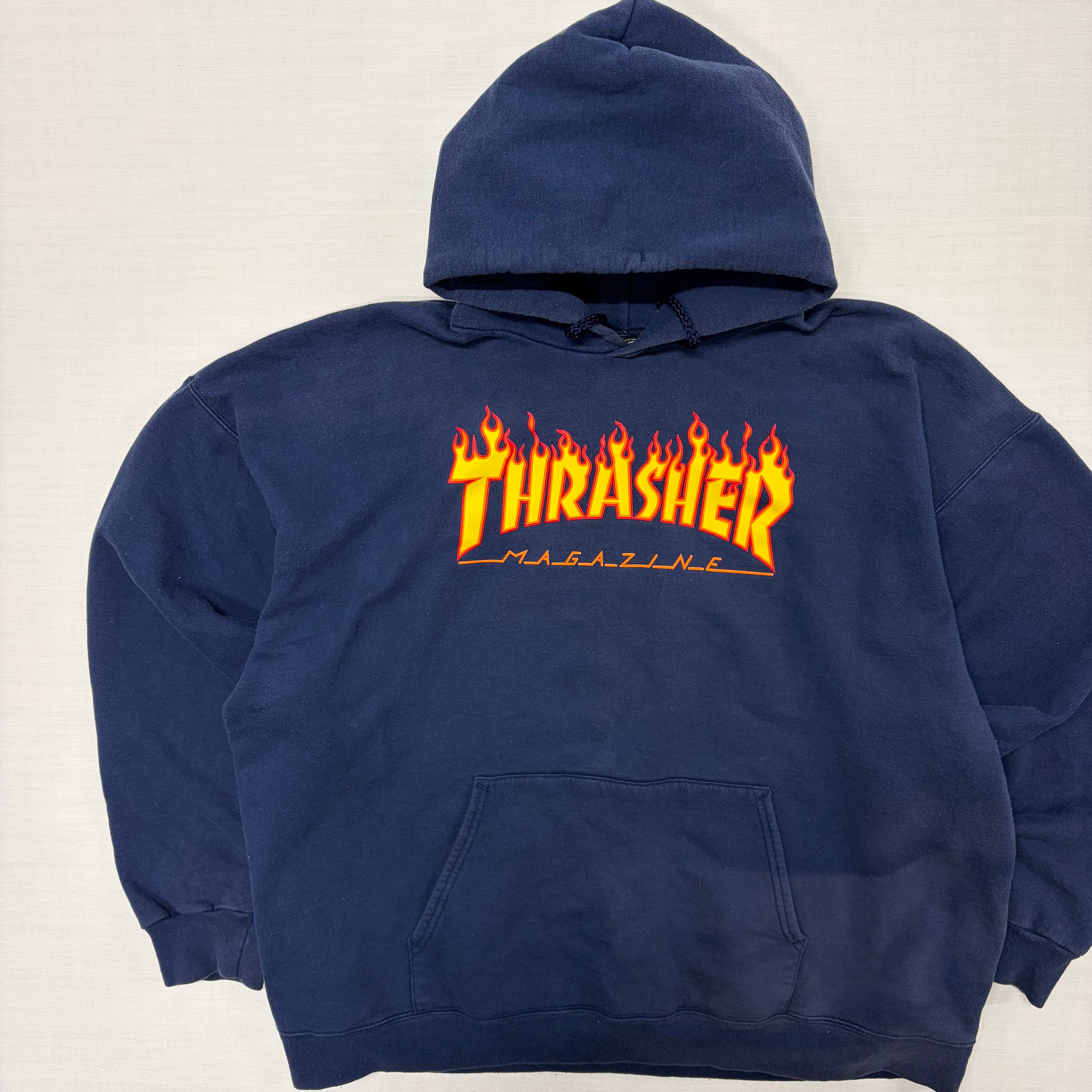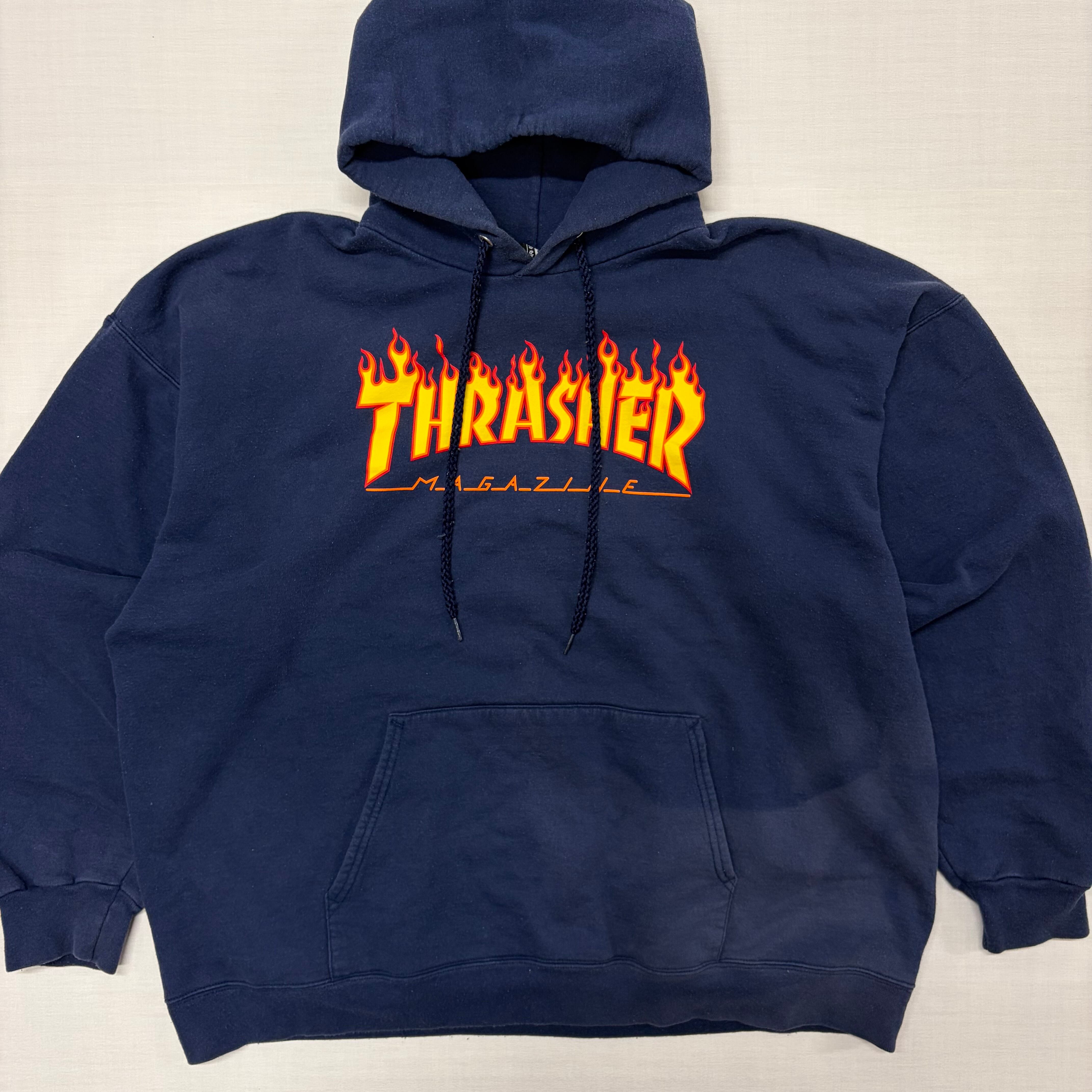 【ATTO】THRASHER フレイムロゴ スウェット パーカー ネイビー L相当 スラッシャー MAGAZINE ファイヤーパターン フーディー 紺 フェード 古着 ストリート スケーター Y2K ビンテージ 90s 00s ユニセックス【3149SA】