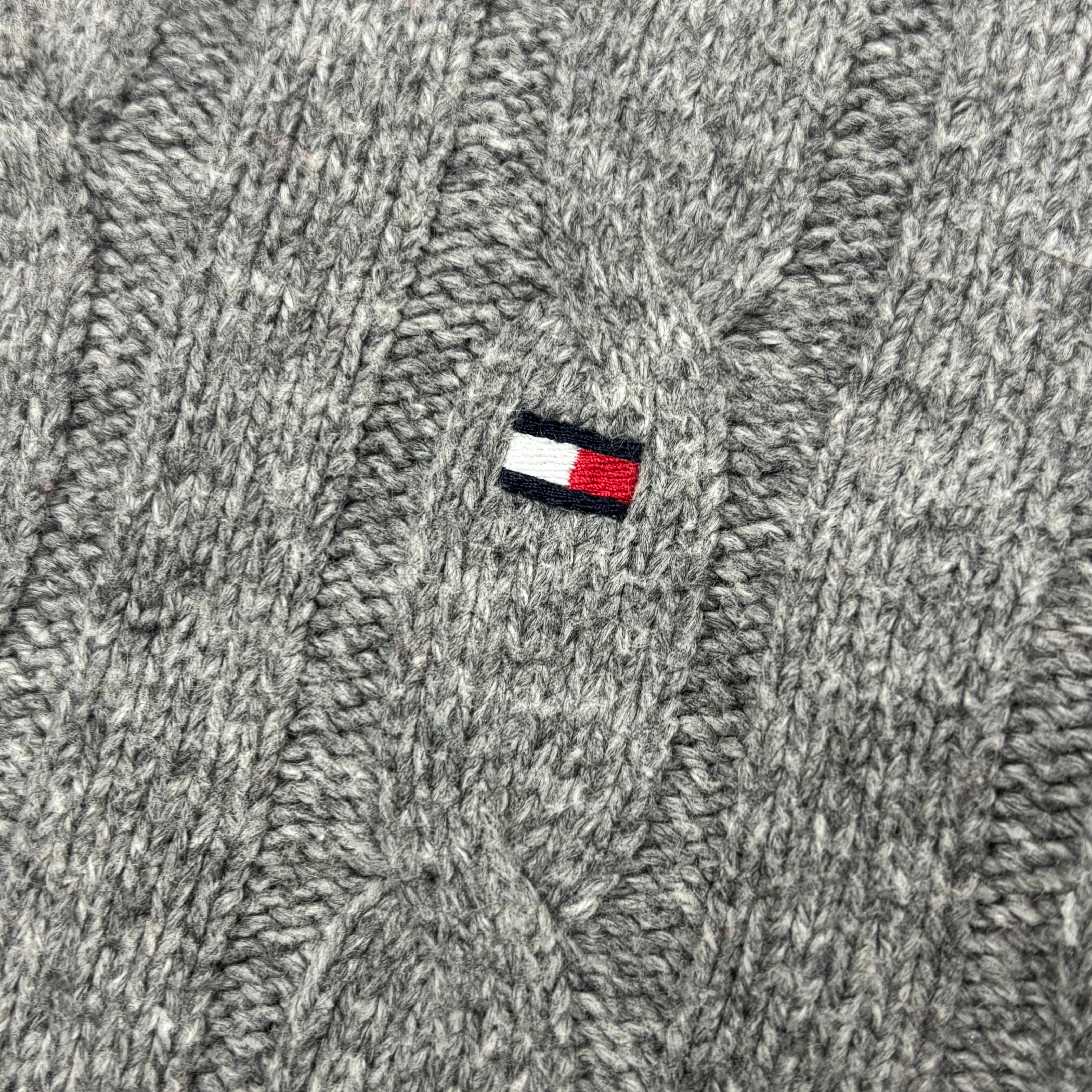 【美品】トミーヒルフィガー ケーブルニット L グレー ショールカラー セーター 刺繍ロゴ【6089ST】