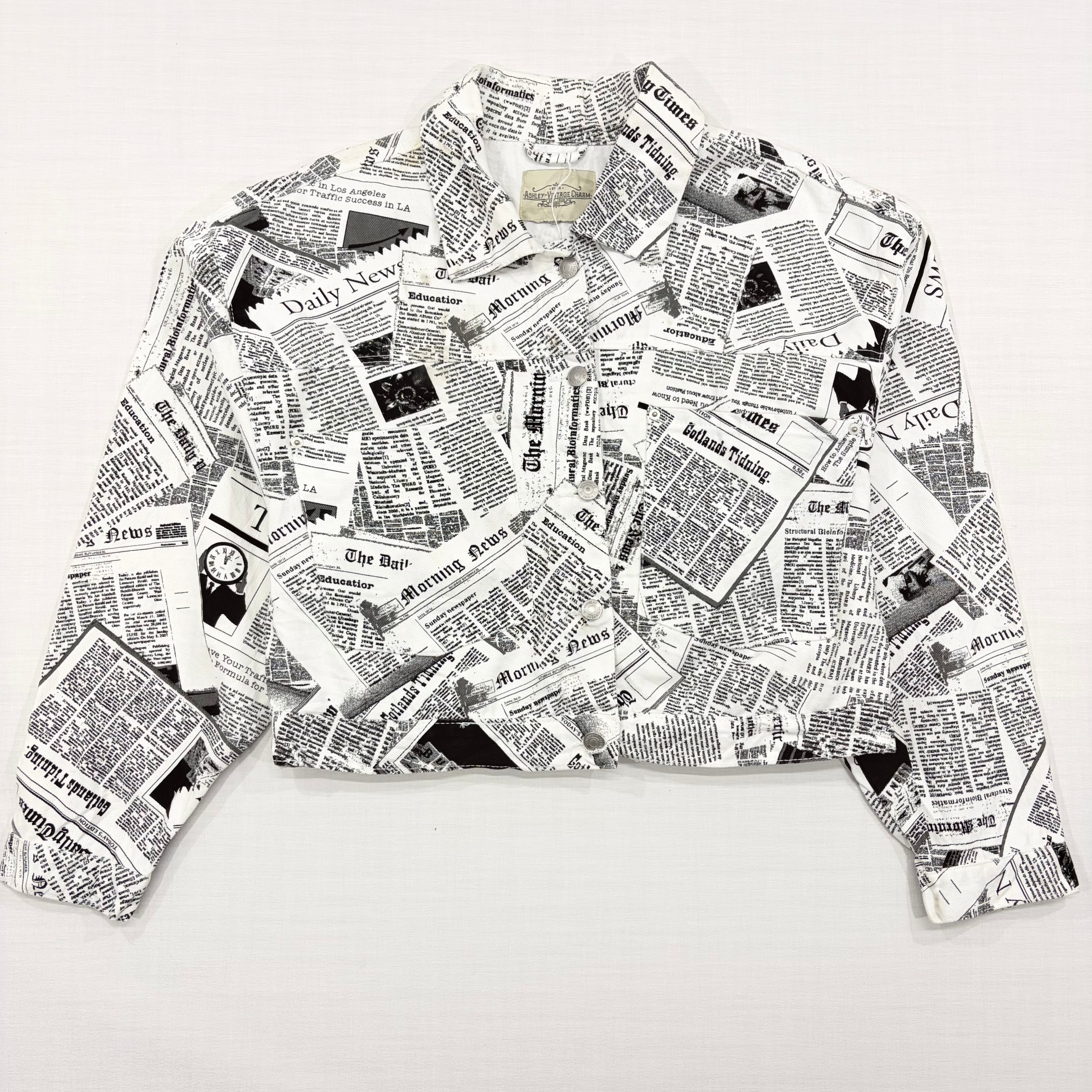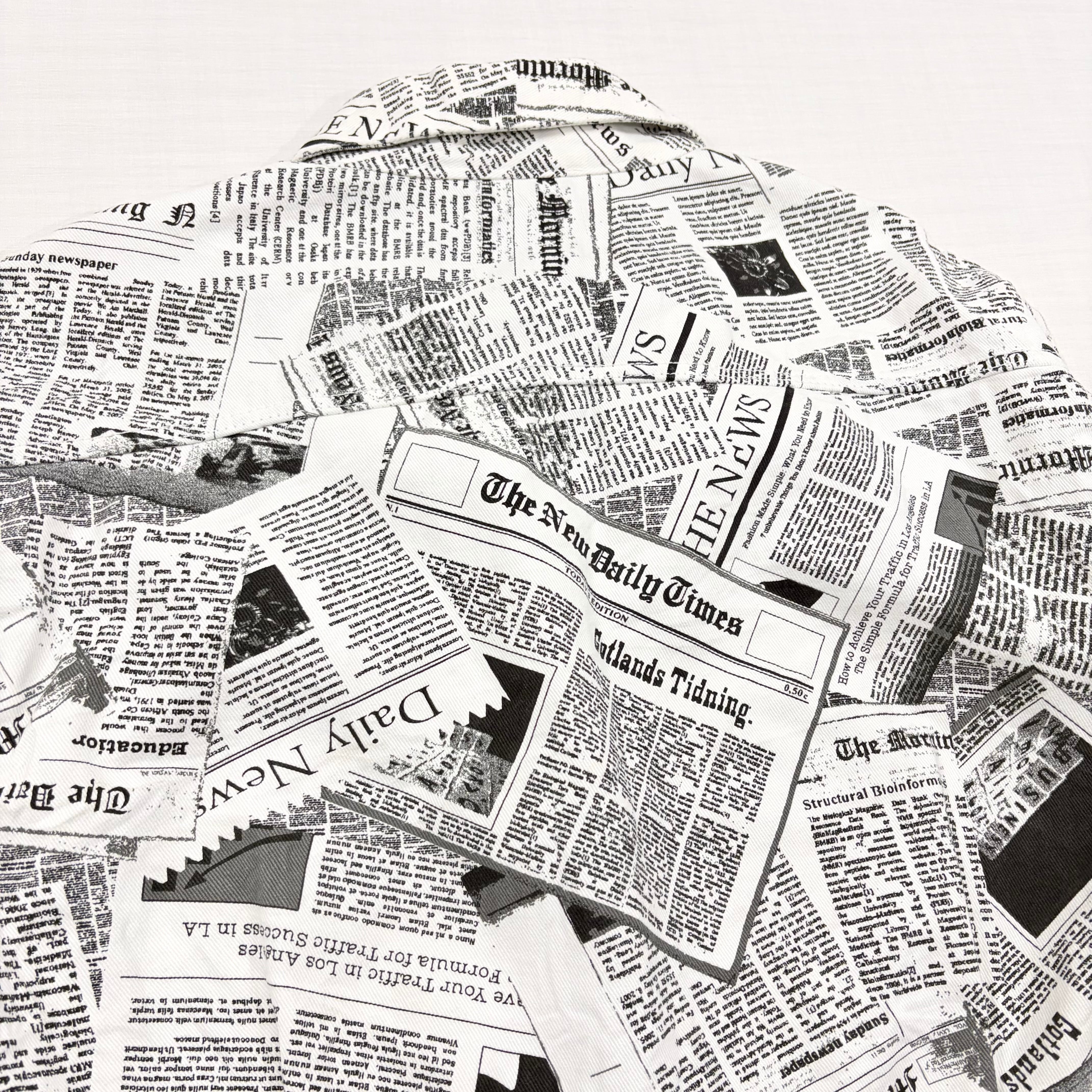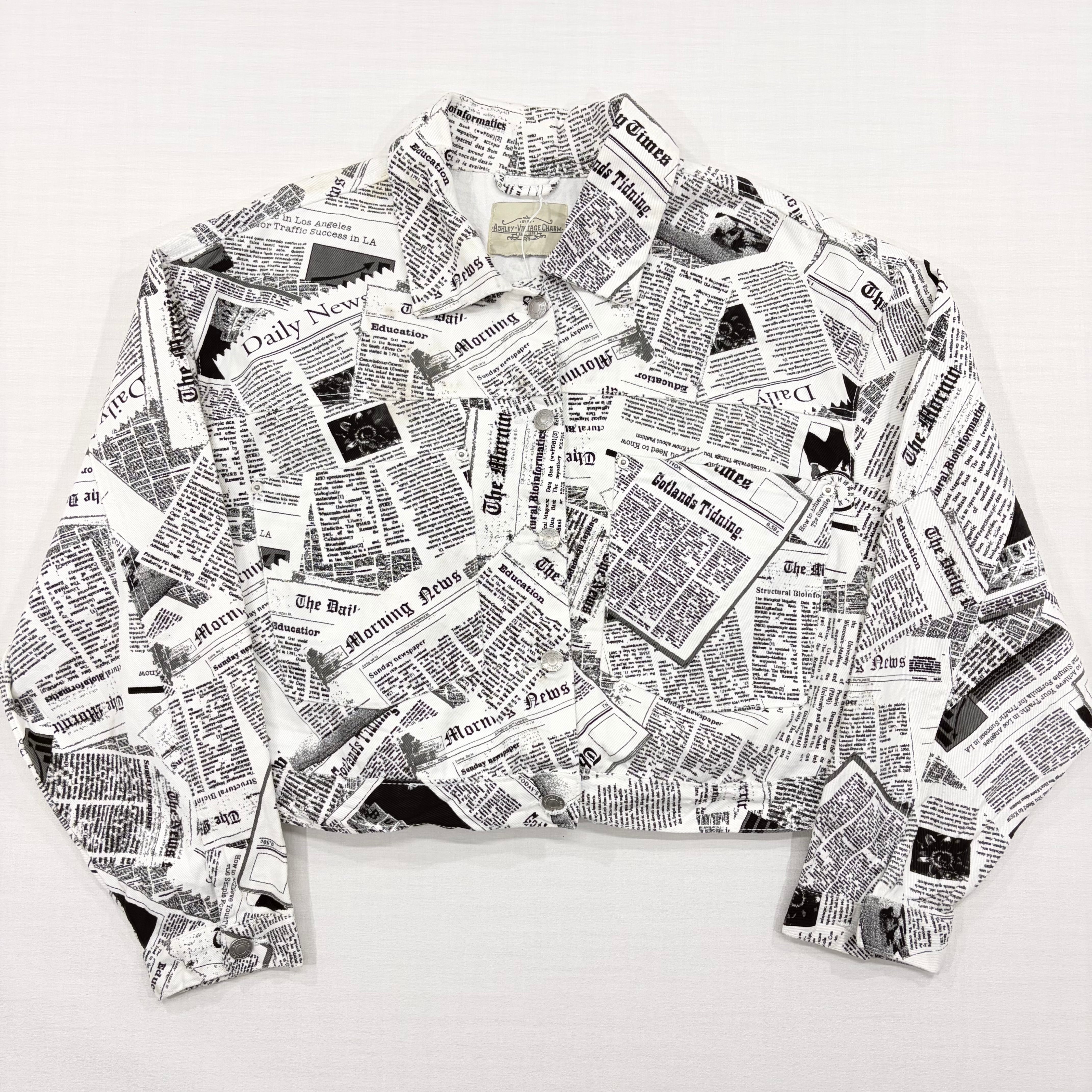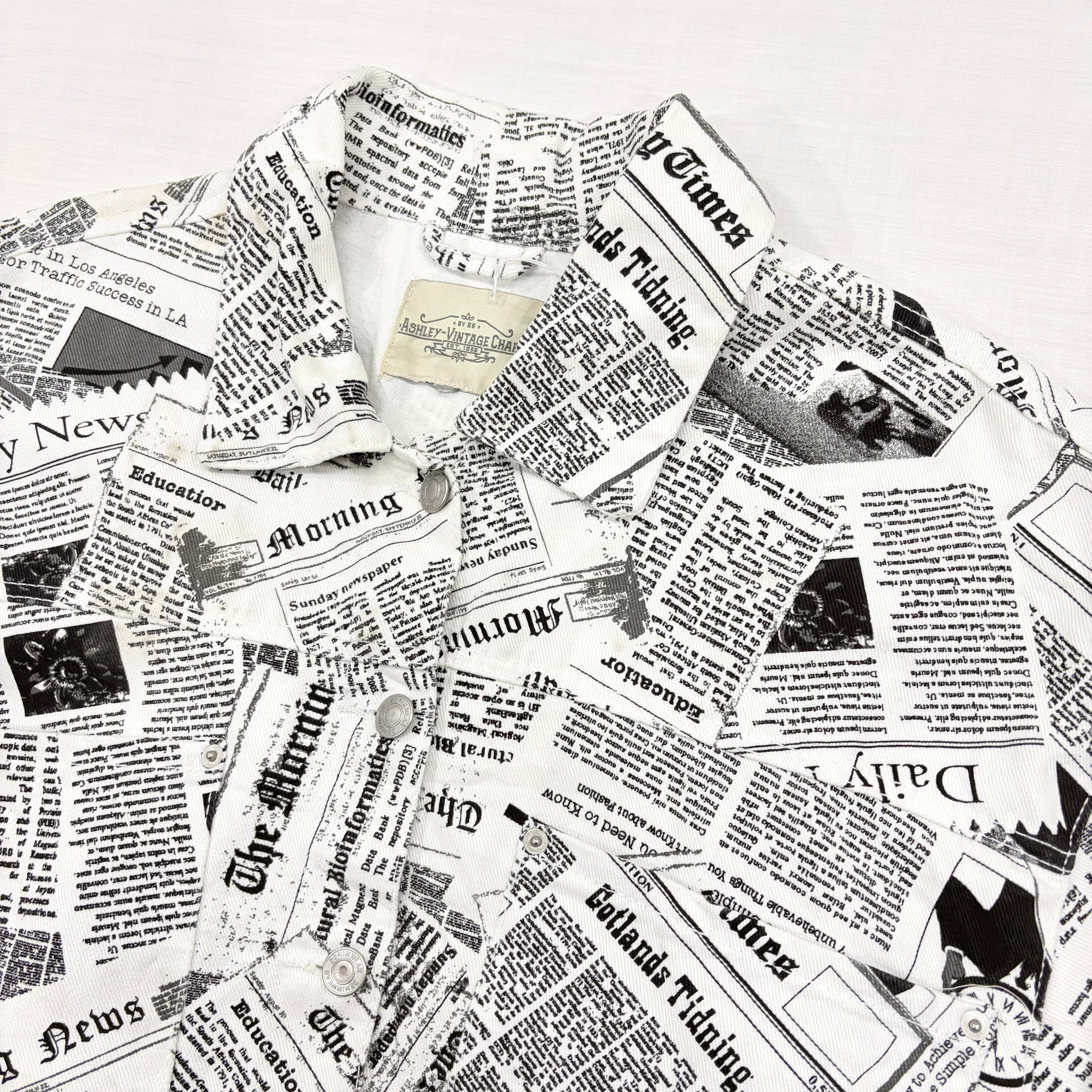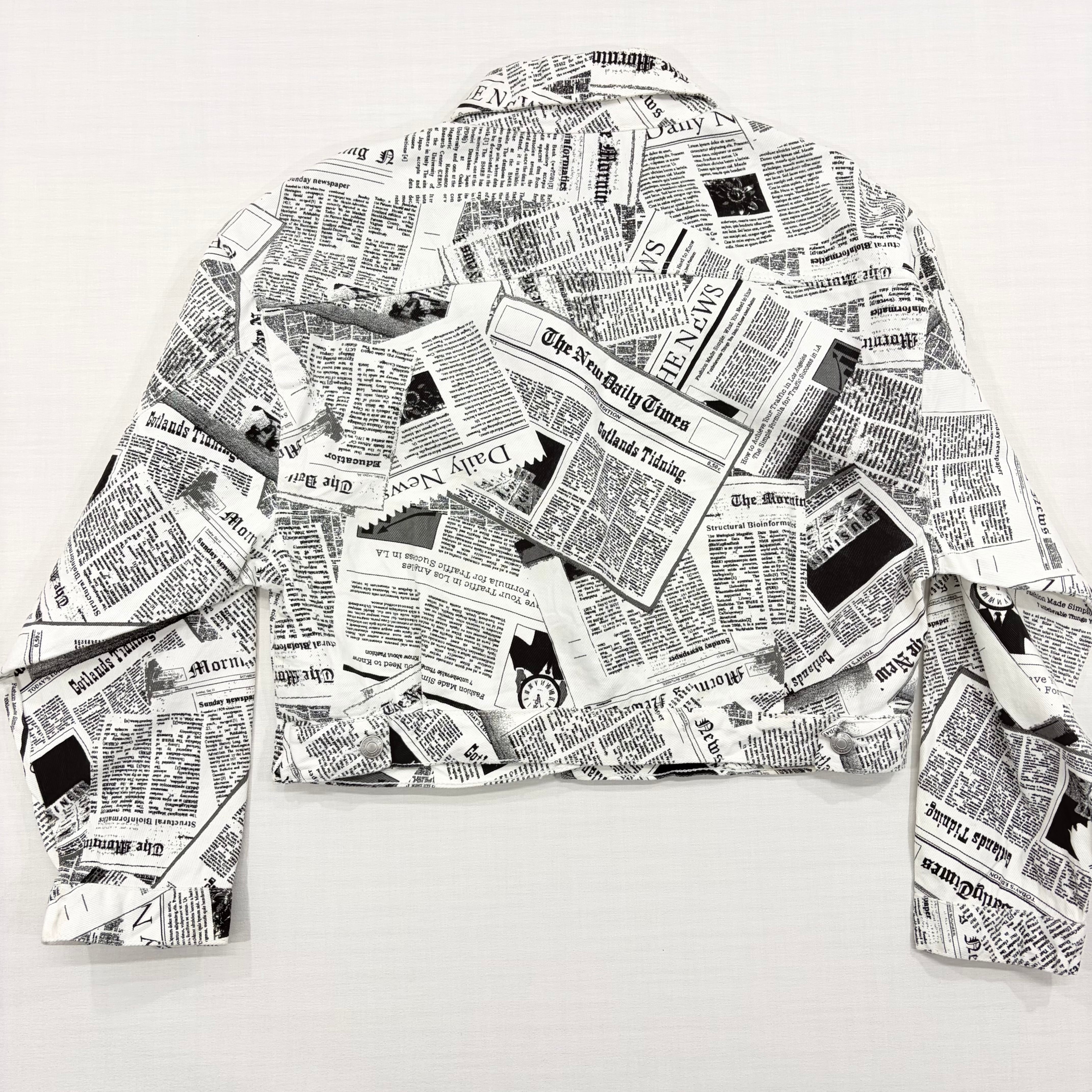 インパクト抜群のニュースペーパー(英字新聞)総柄デザインが目を惹くデニムジャケットです。