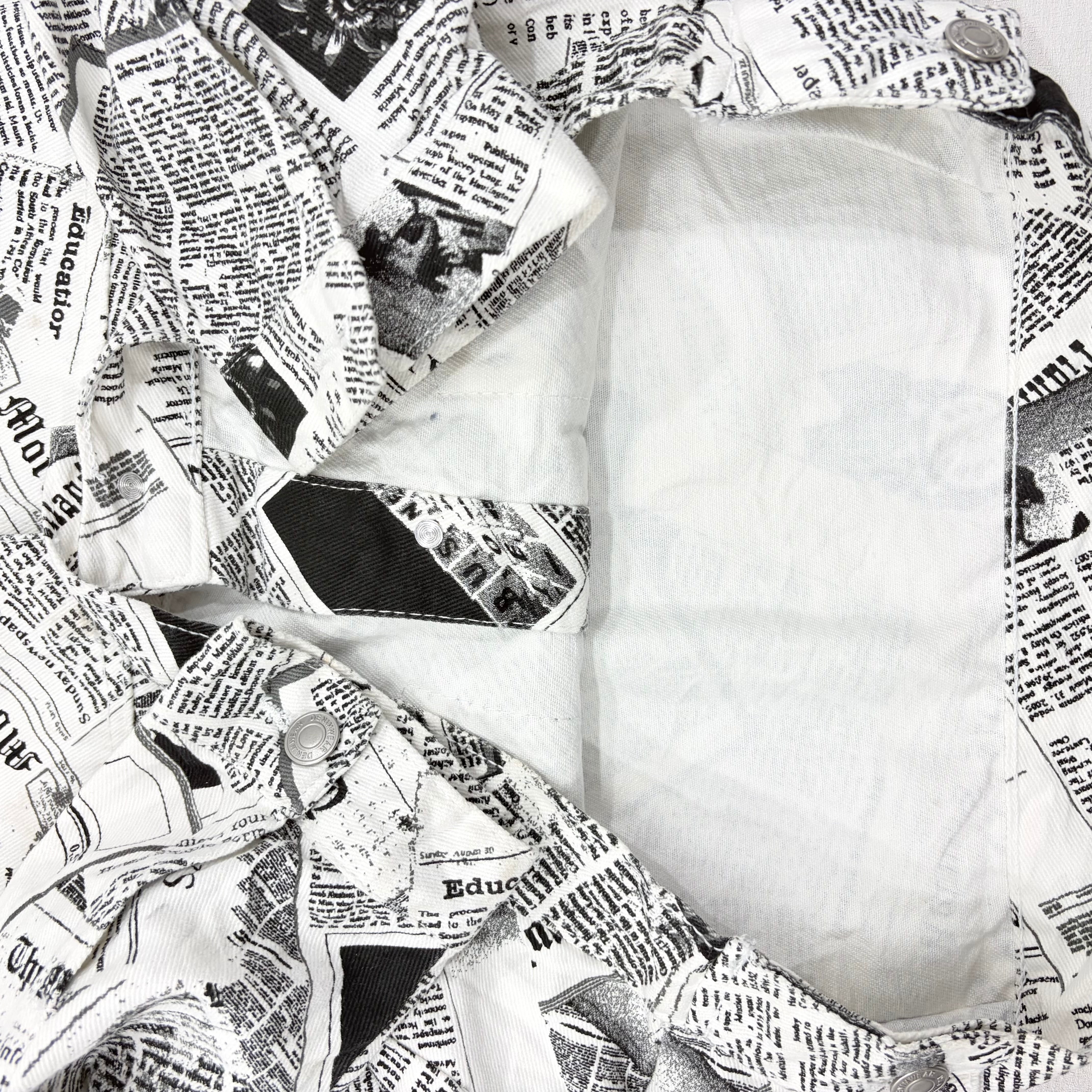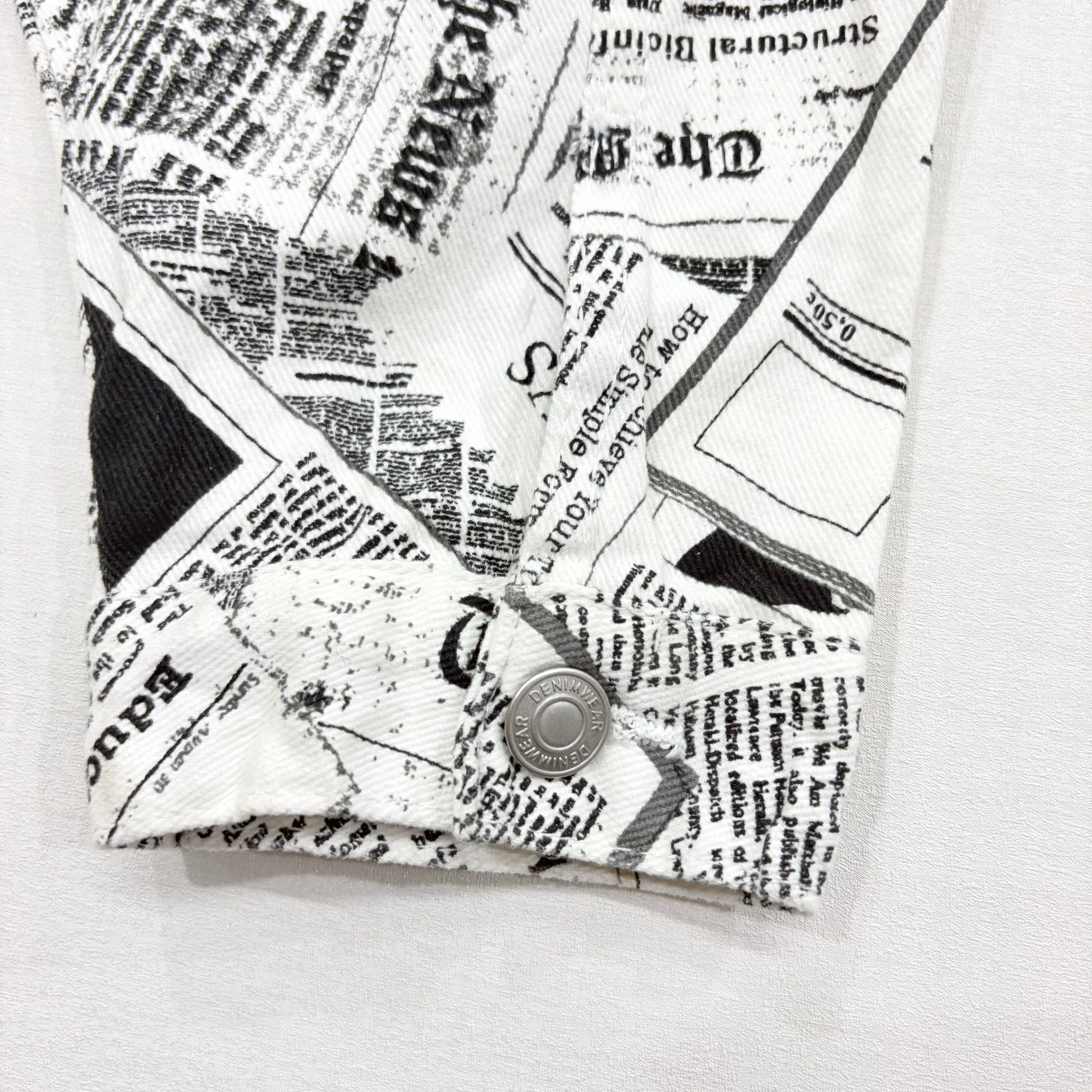 【希少柄】ニュースペーパー 総柄 デニムジャケット L 白黒 Y2K ショート クロップド Gジャン 即日発送【6095ST】