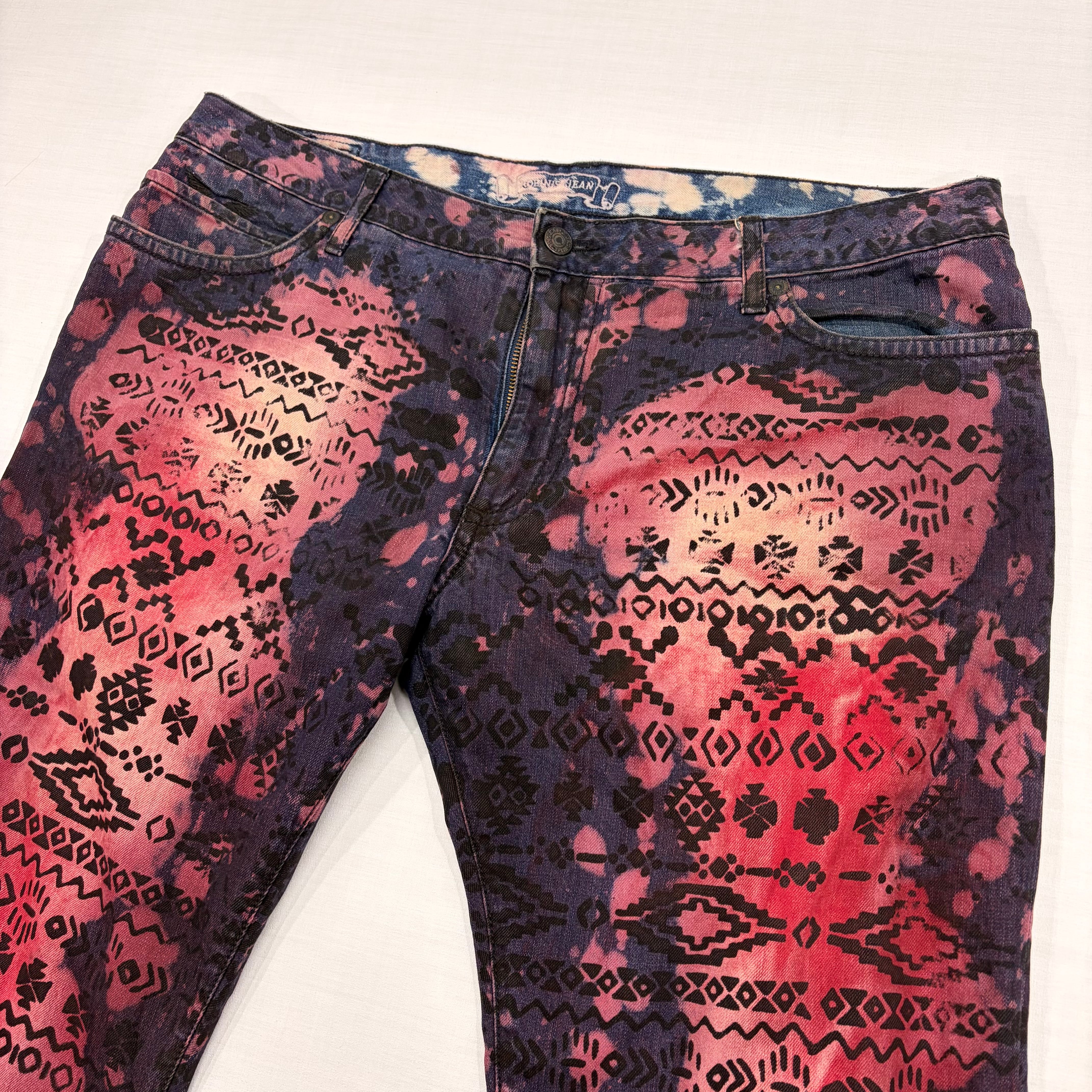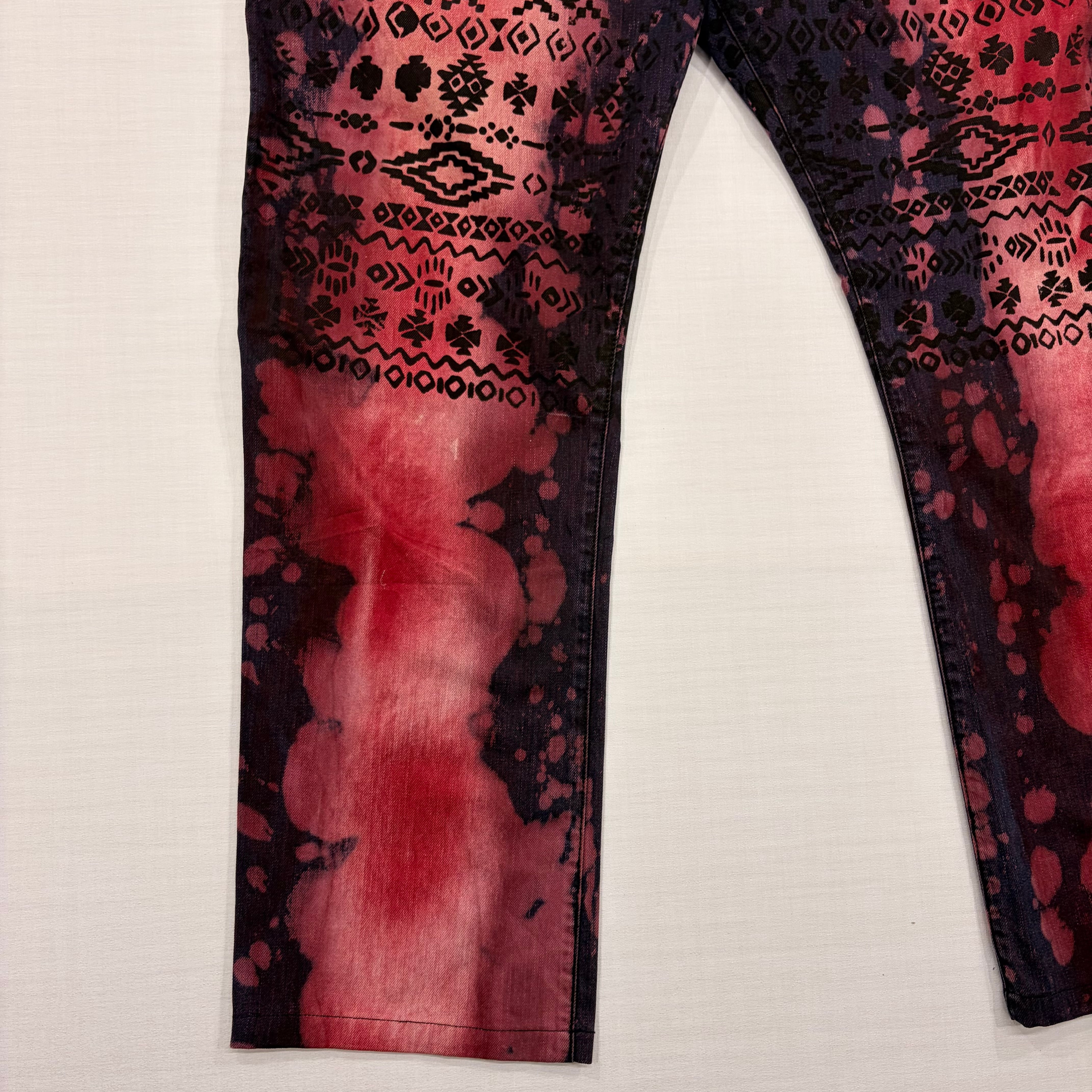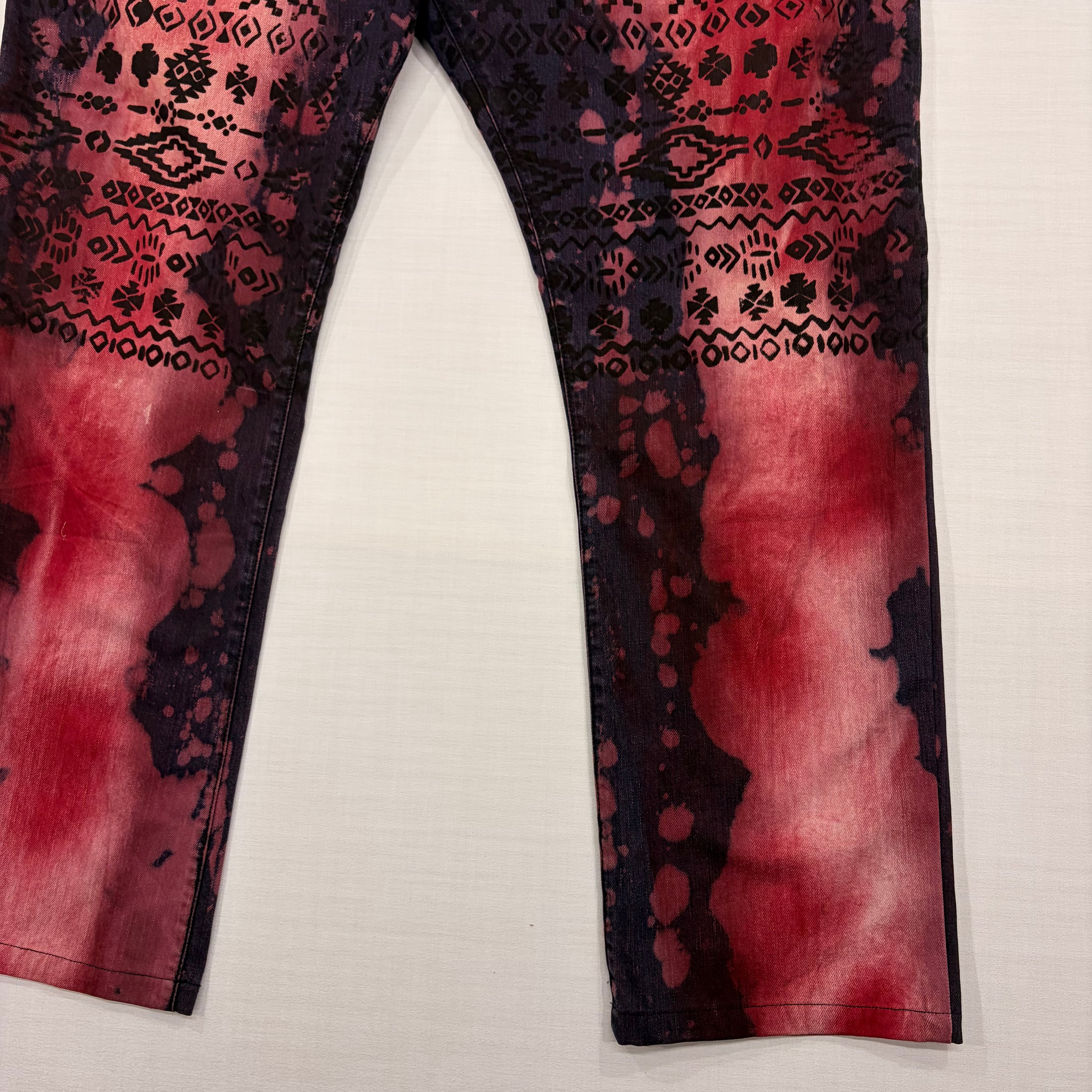 目を惹くインディゴ×レッドのブリーチ加工に、トライバル系の総柄プリントが施された非常に珍しいデザイン。