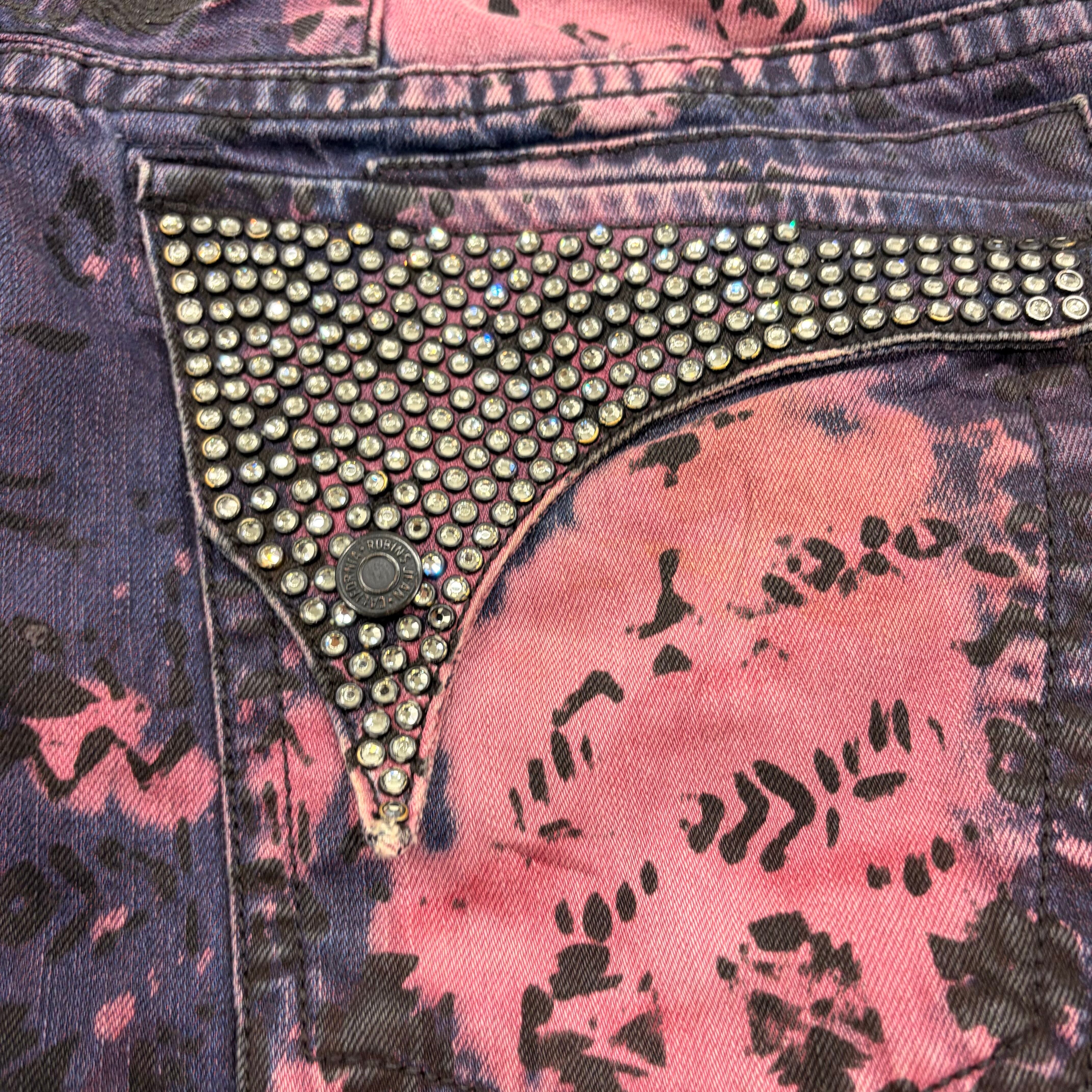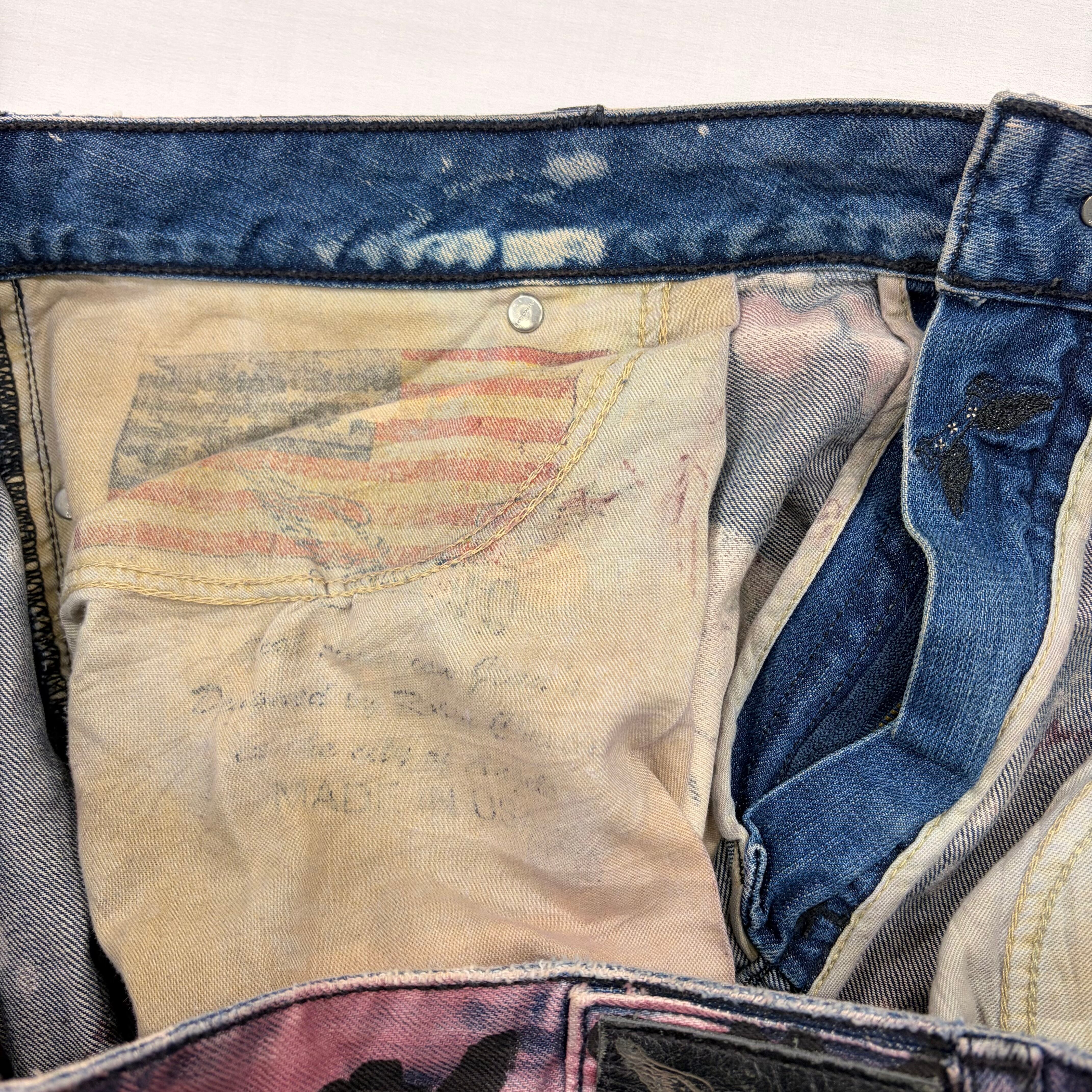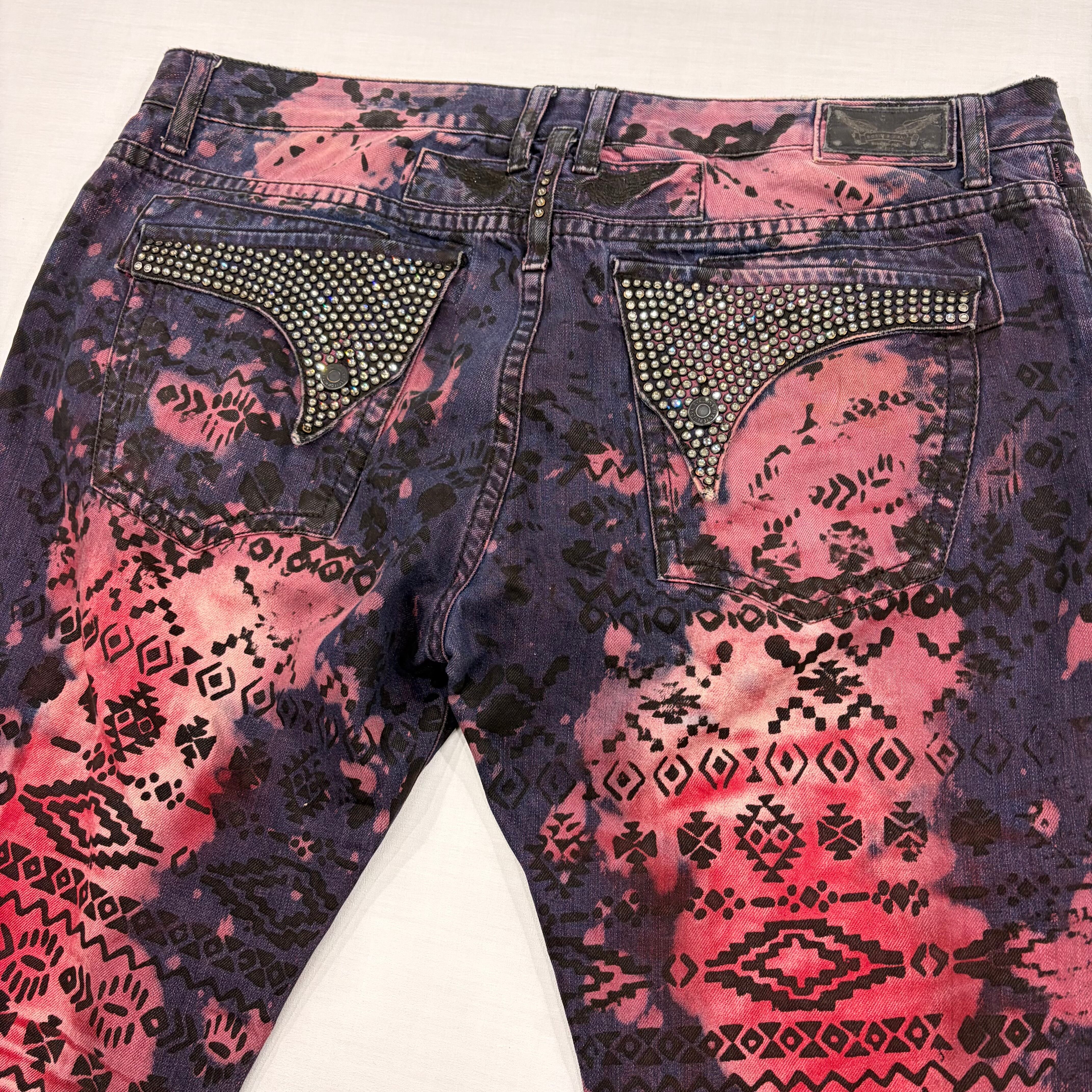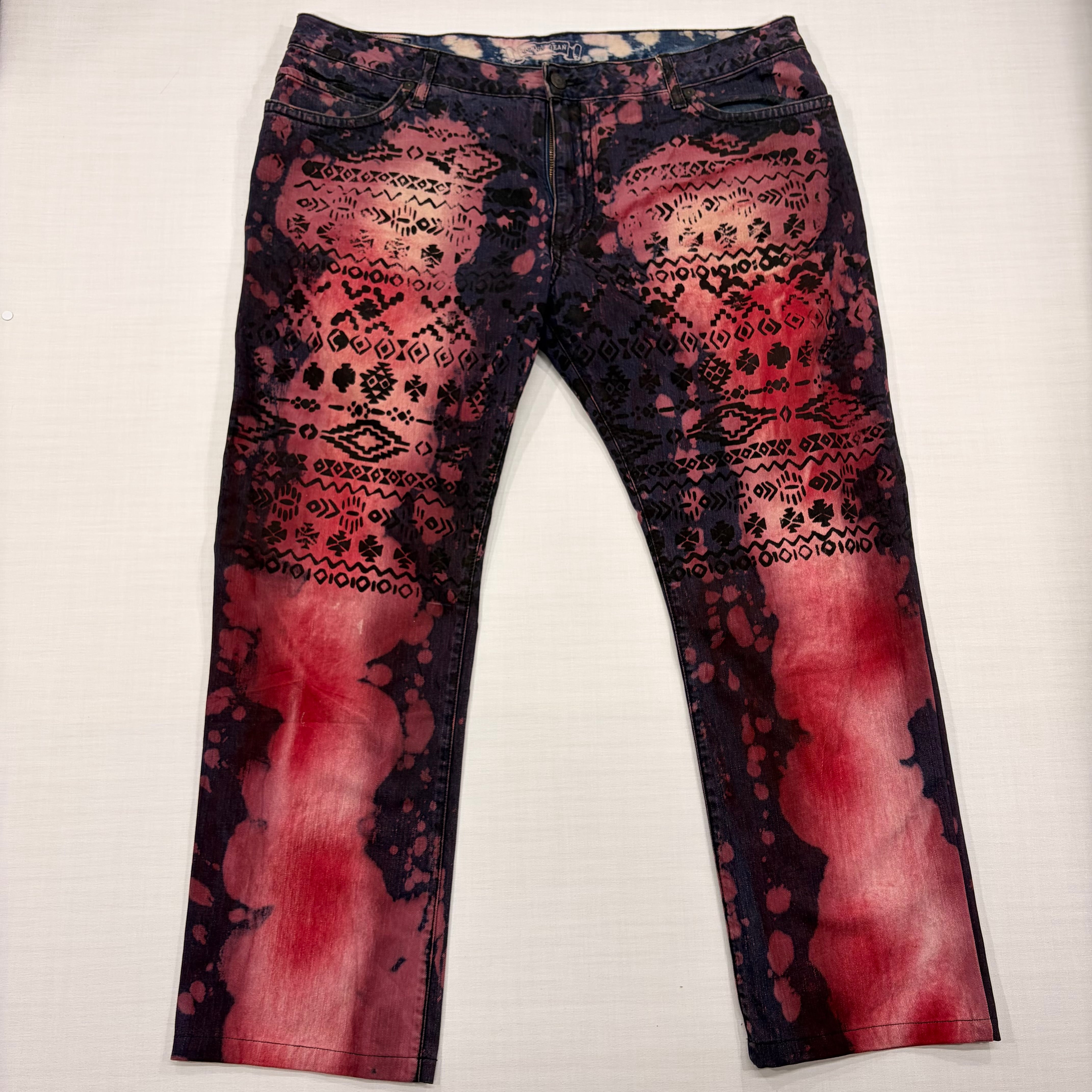 目を惹くインディゴ×レッドのブリーチ加工に、トライバル系の総柄プリントが施された非常に珍しいデザイン。